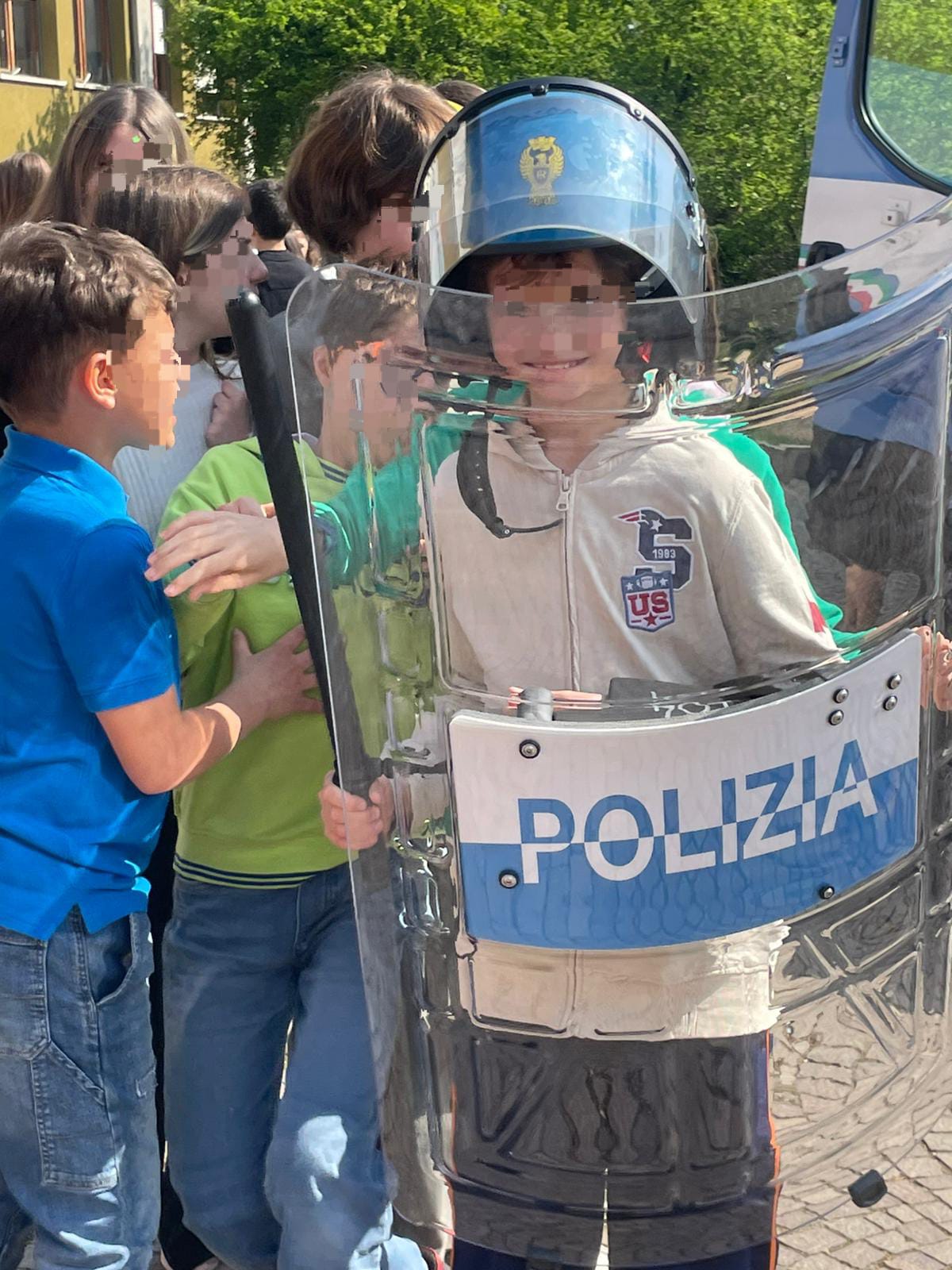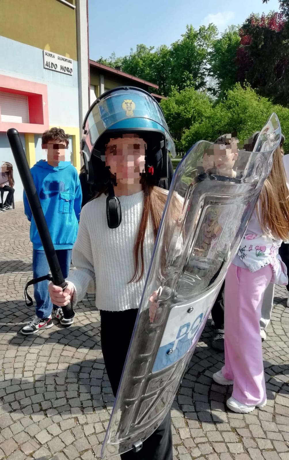 Con grande curiosità, i ragazzi hanno potuto indossare il casco e impugnare lo sfollagente e lo scudo di protezione, comprendendo l’importanza di questi strumenti per la sicurezza di tutti.