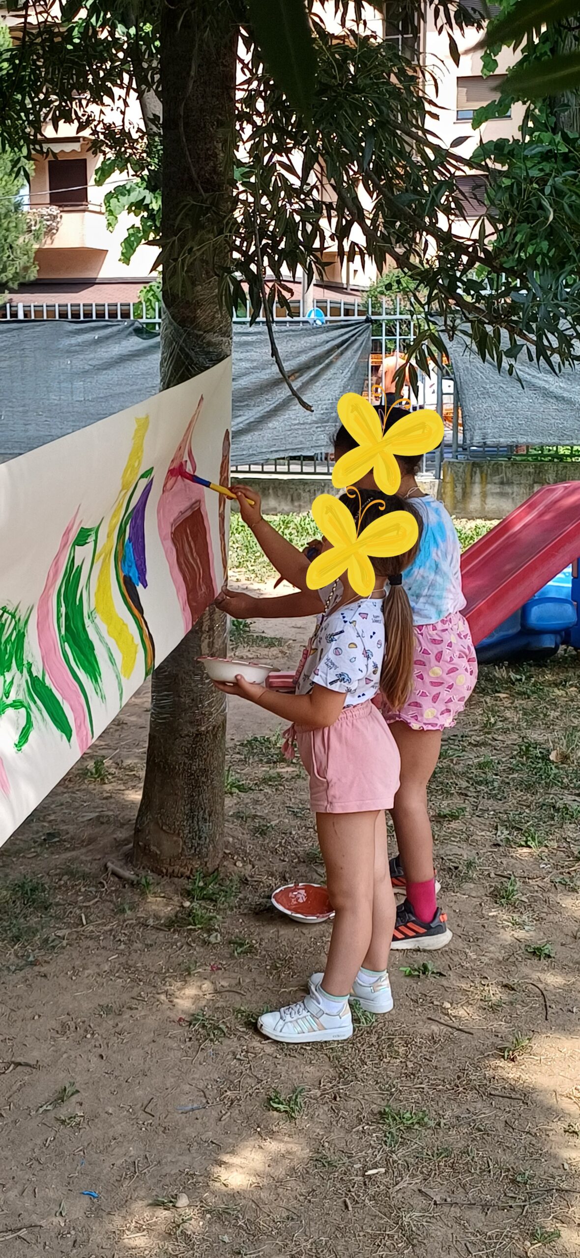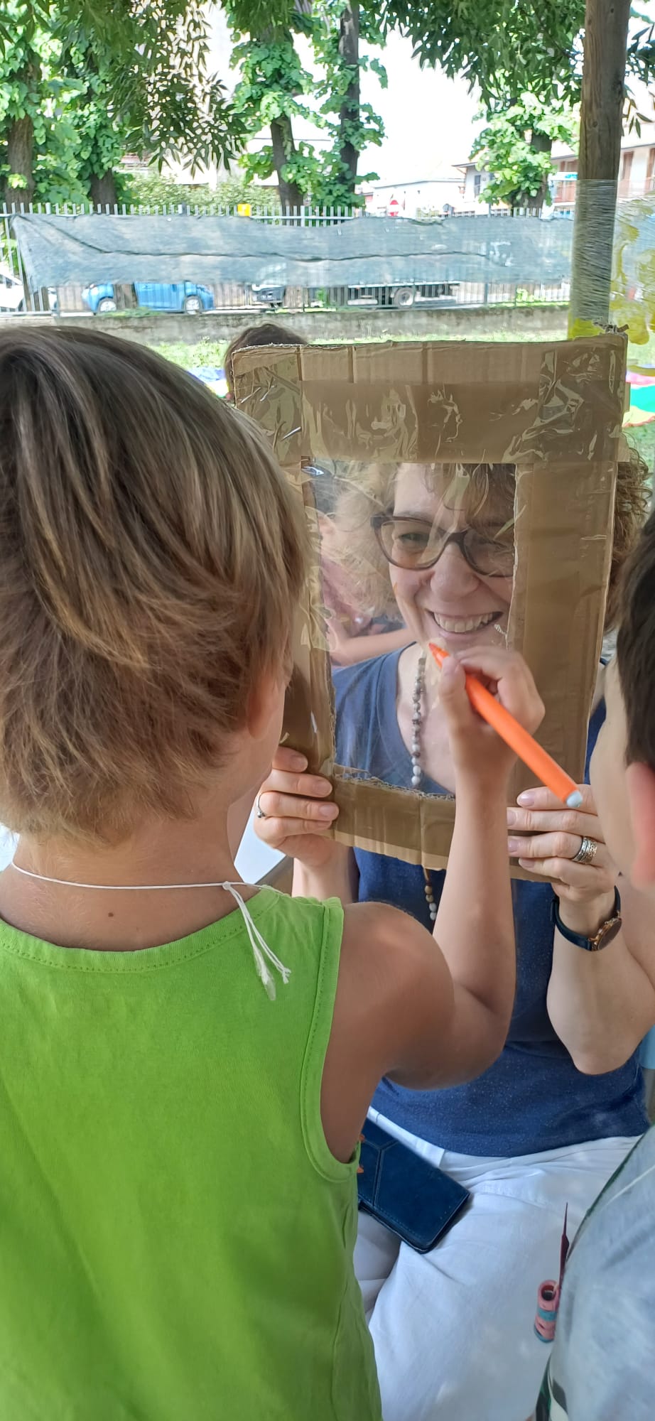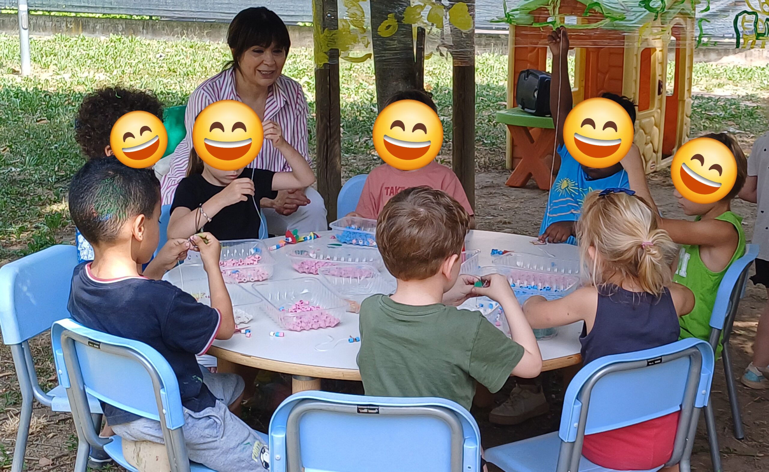 Tra i momenti più coinvolgenti, due laboratori speciali hanno lasciato il segno: il primo all’aperto, dove bambini e insegnanti hanno trasformato una semplice pellicola trasparente in una tela collettiva di colori e segni; il secondo, più paziente e concentrato, ha visto tutti impegnati nella creazione di collane con perline variopinte, infilate con cura da veri e propri artigiani in miniatura.