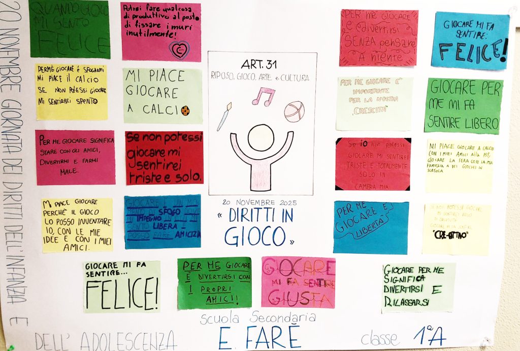 Agli alunni delle classi prime è stato chiesto di pensare a questo, soffermandosi sulla necessità che ogni bambino nasca nel  diritto indiscutibile  al gioco, al riposo ed alla partecipazione ad attività ricreative adeguate all’età. Diritto indiscutibile ma a rischio in molti dei Paesi con prevalente disagio educativo, economico e sociale.